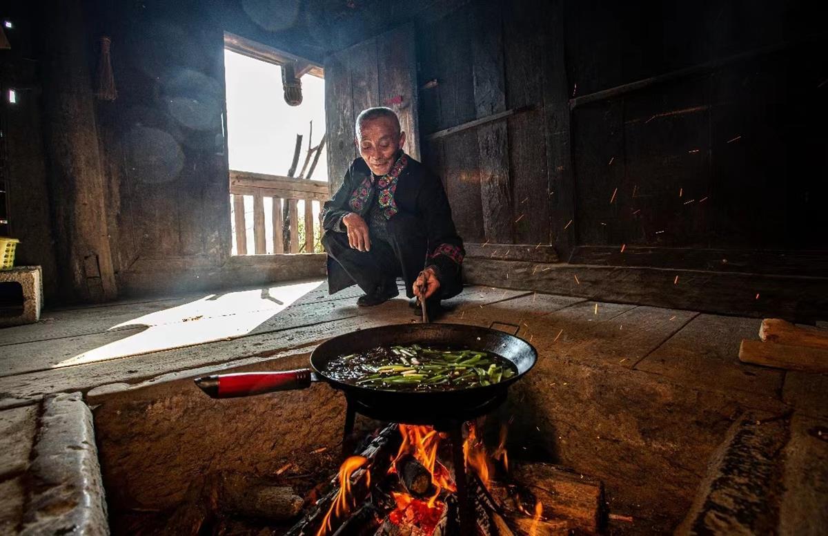 10月30日傍晚,百福司镇舍米湖村5组的一栋老木屋里,70多岁的土家族老人彭大爷在土火坑里架起“三脚”,放上铁锅,添柴入灶,开始制作油茶汤,招待来客。只见他往锅中倾入猪油,油热以后倒入粗茶。茶叶下锅,瞬间舒展叶片,伴随着“刺啦刺啦”的声音,释放出浓浓的焦香。