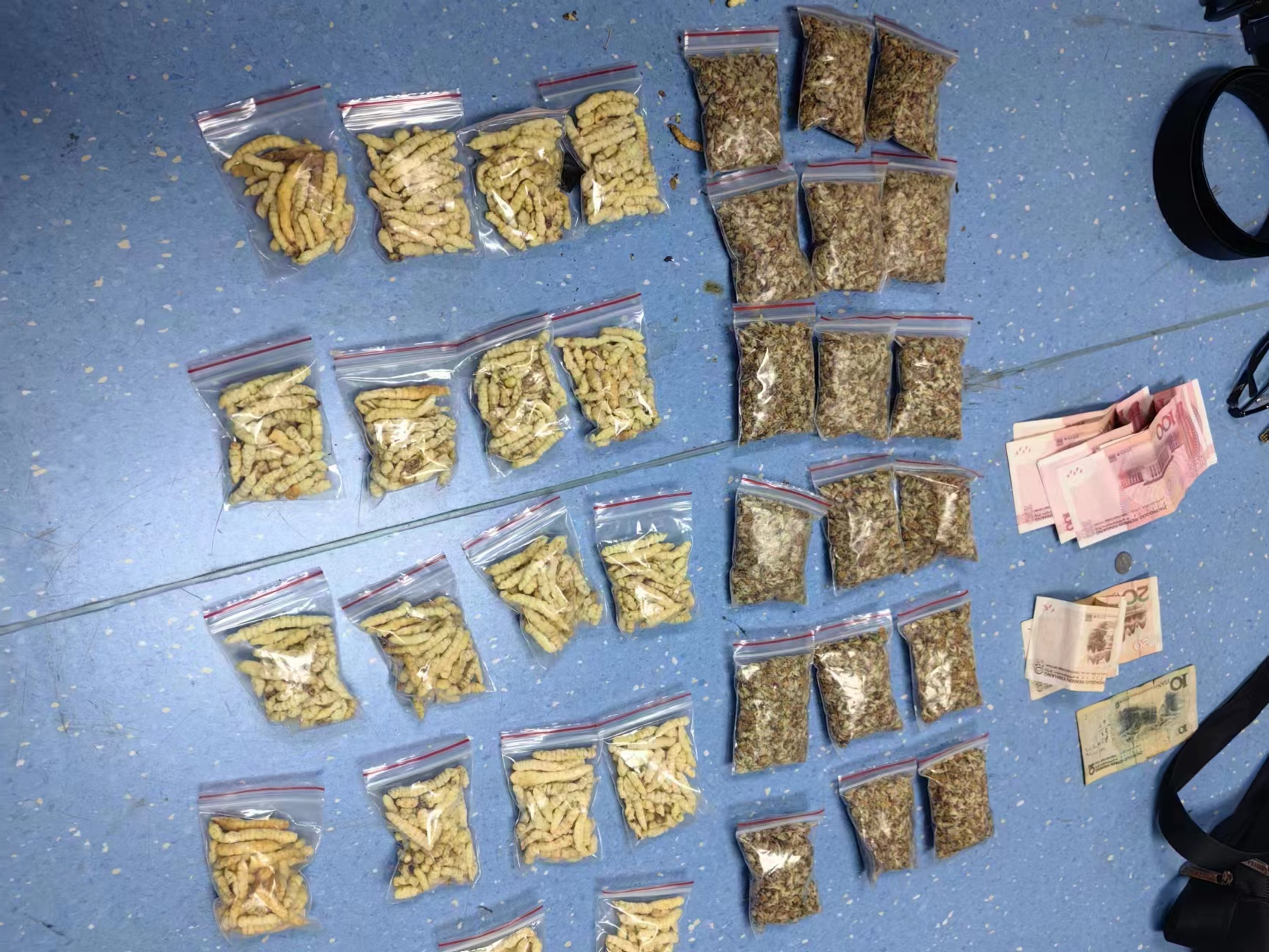 8月9日,几名嫌疑人到浠水县城区一医院附近准备再次唱一出“双簧”时,被民警当场抓获,扣押“冬虫夏草”数十包。