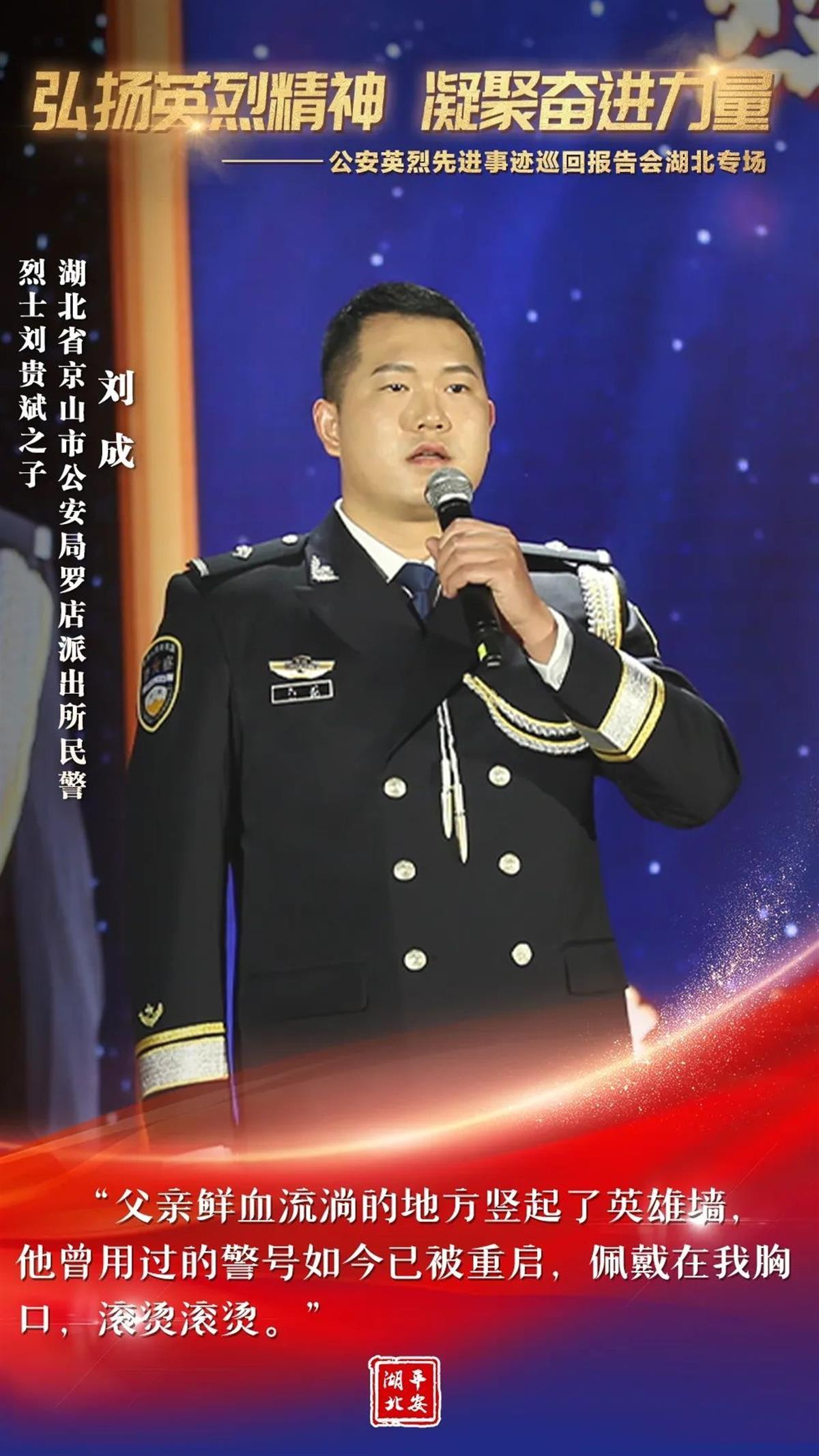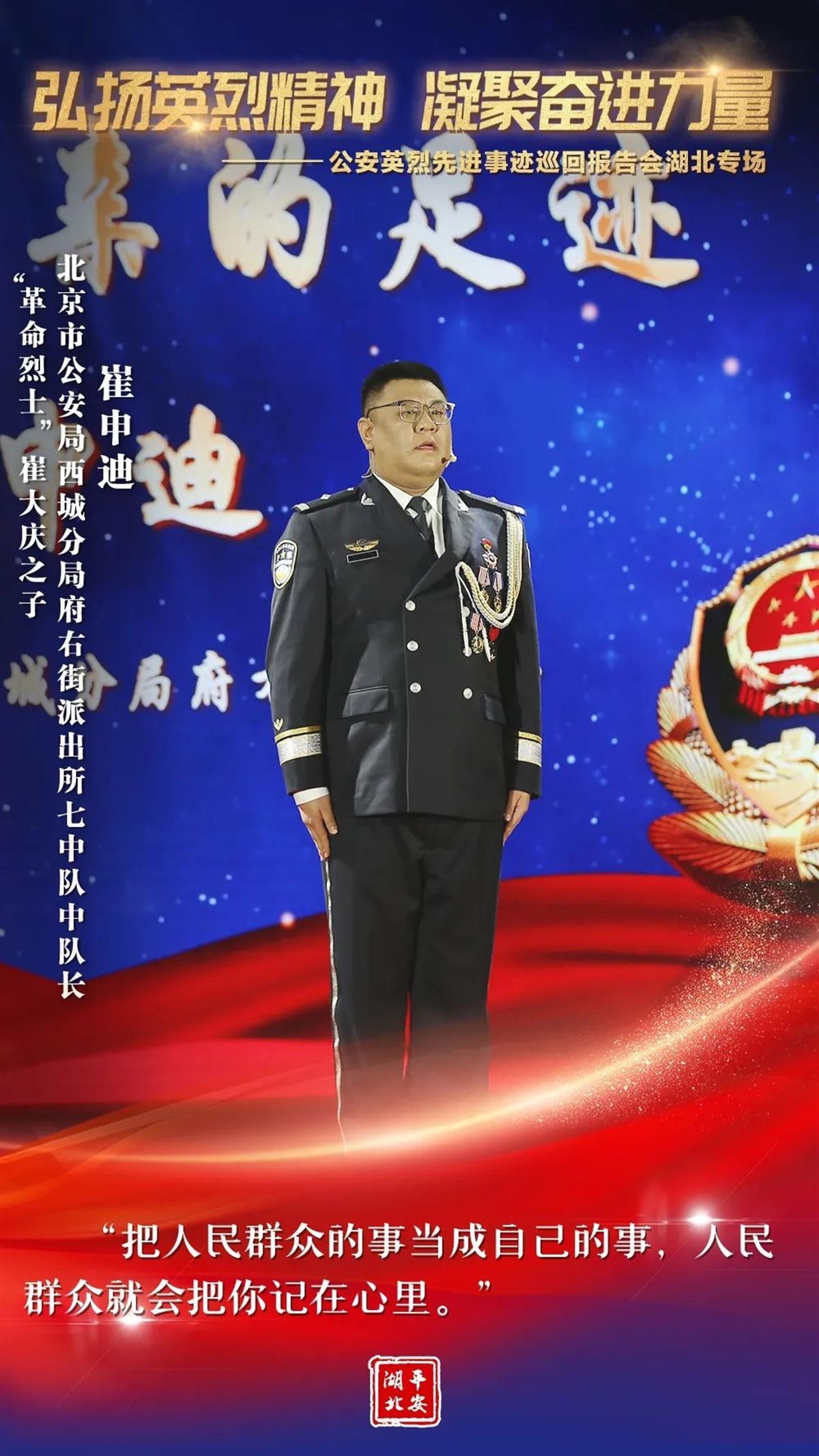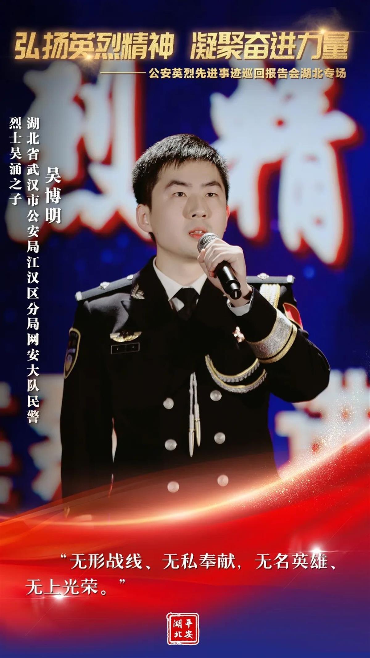 为有牺牲多壮志。“为什么我的眼里常含泪水?因为我对这土地爱得深沉!”大地作证,每一片安宁的土地,都有人民警察血写的忠诚!借助这次让人荡气回肠的报告会,让我们由衷地缅怀那些为国家长治久安和人民安居乐业献出宝贵生命的公安英烈。同时,我们也深切地期待,通过类似的学习、宣传、践行活动,找回一种温暖人心的情感,找回一种英勇无畏的品格,找回一种薪火相传的精神,让“人民警察爱人民、人民警察人民爱”的动人乐章历久不衰!