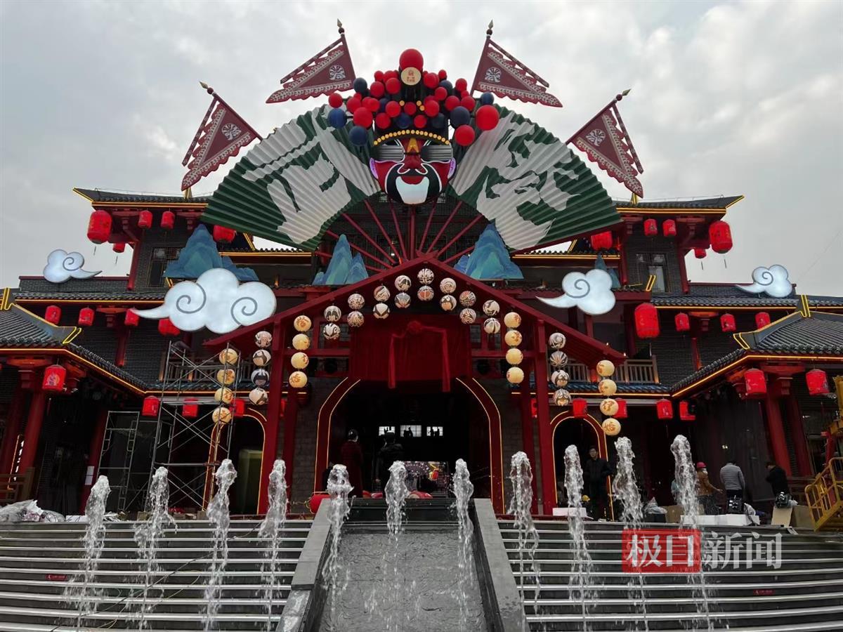 沿街店铺门口,一串串红灯笼挂起,扮相惊艳的花旦挥舞着衣袖在戏台上动人歌唱,朝天门火锅城等老字号招牌分外显眼。