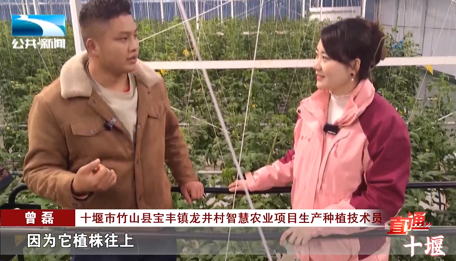 十堰市竹山县宝丰镇龙井村智慧农业项目生产种植技术员曾磊:“我们这个大棚是全部采用的立体栽培模式,它是从苗子一直往上长,它的产量可能会更高,因为它植株往上,空间利用率更高。”