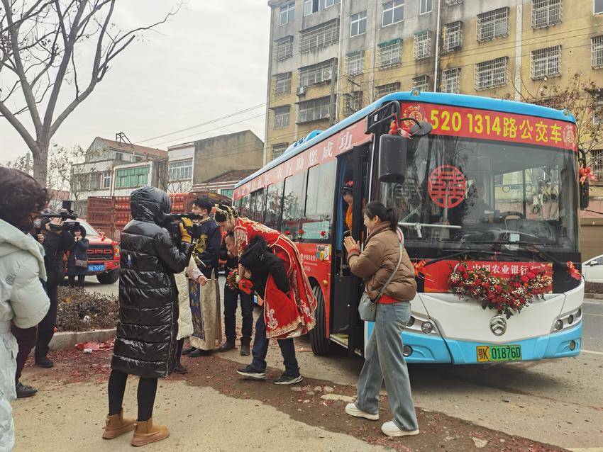 1月21日上午,在云梦城区,一辆“红妆”的5201314路公交车迎面驶来,格外显眼,它用金红色的结婚宣言贴满车身、大红的“囍”字装饰车窗、红玫瑰与彩色装饰填满车厢。一对新人租用公交车作为婚车,用一场特别的“迎亲”仪式开启两人的幸福旅程。