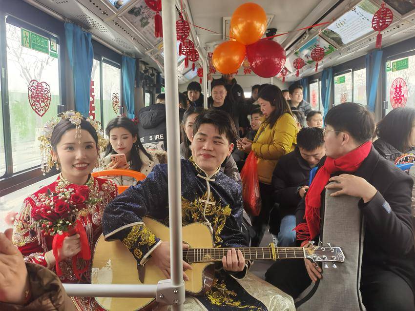 这趟幸福的公交婚车也成为路人关注的焦点,公交车上的亲友们不停夸赞,用手机记录着,并点赞这种喜事新办简办的新时尚。