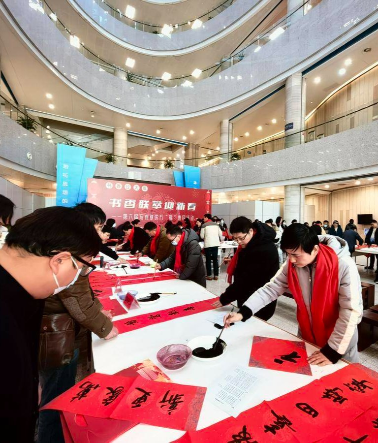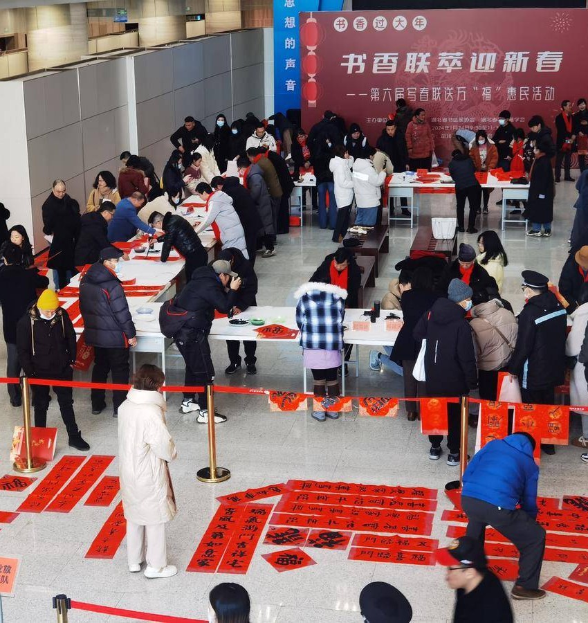 喜阅龙腾欣挥笔,书香新岁共迎春。1月24日,癸卯年腊月十四,书香联萃迎新春——第六届写春联送万“福”惠民活动在湖北省图书馆举行。30余位书法艺术家现场挥毫泼墨,书写春联、福字,为读者送上一份书墨飘香的年礼。