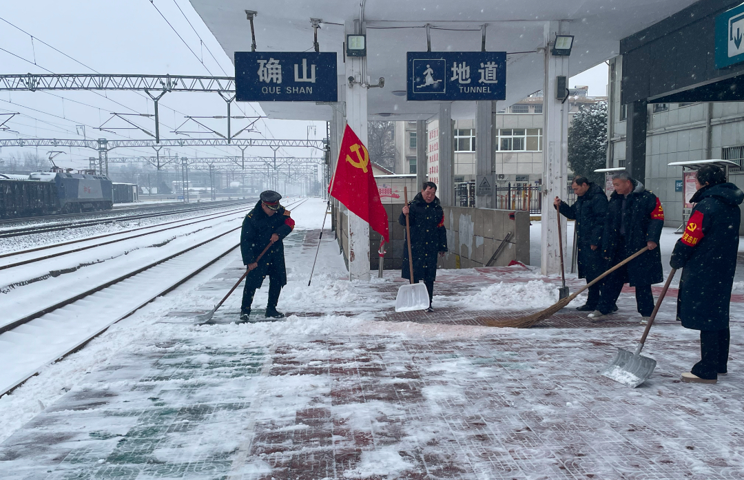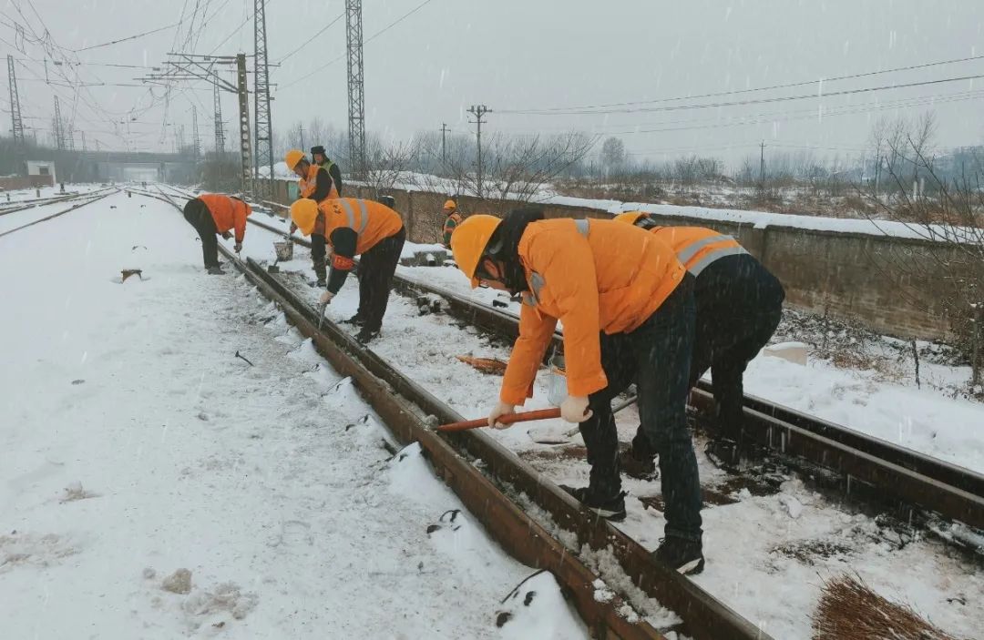 各单位党员突击队利用雪铲、扫帚,除雪机、火焰喷枪等设备,加强站前及站台、道岔的除冰扫雪工作,全力保障旅客出行安全。