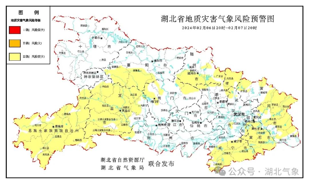 2024年2月6日20时—2月7日20时,预计三峡库区,宜昌地区、恩施地区、鄂州市、黄石地区、咸宁地区、黄冈地区,襄阳(保康、南漳、宜城西部)、荆门(荆门市城区、钟祥、京山北部)、荆州(松滋西部)、随州(曾都区、随县南部、广水)、孝感(安陆北部、孝昌东北部、大悟)、武汉(黄陂北部、江夏中部)以及其他强降雨雪区域发生崩塌、滑坡、泥石流的风险较大。