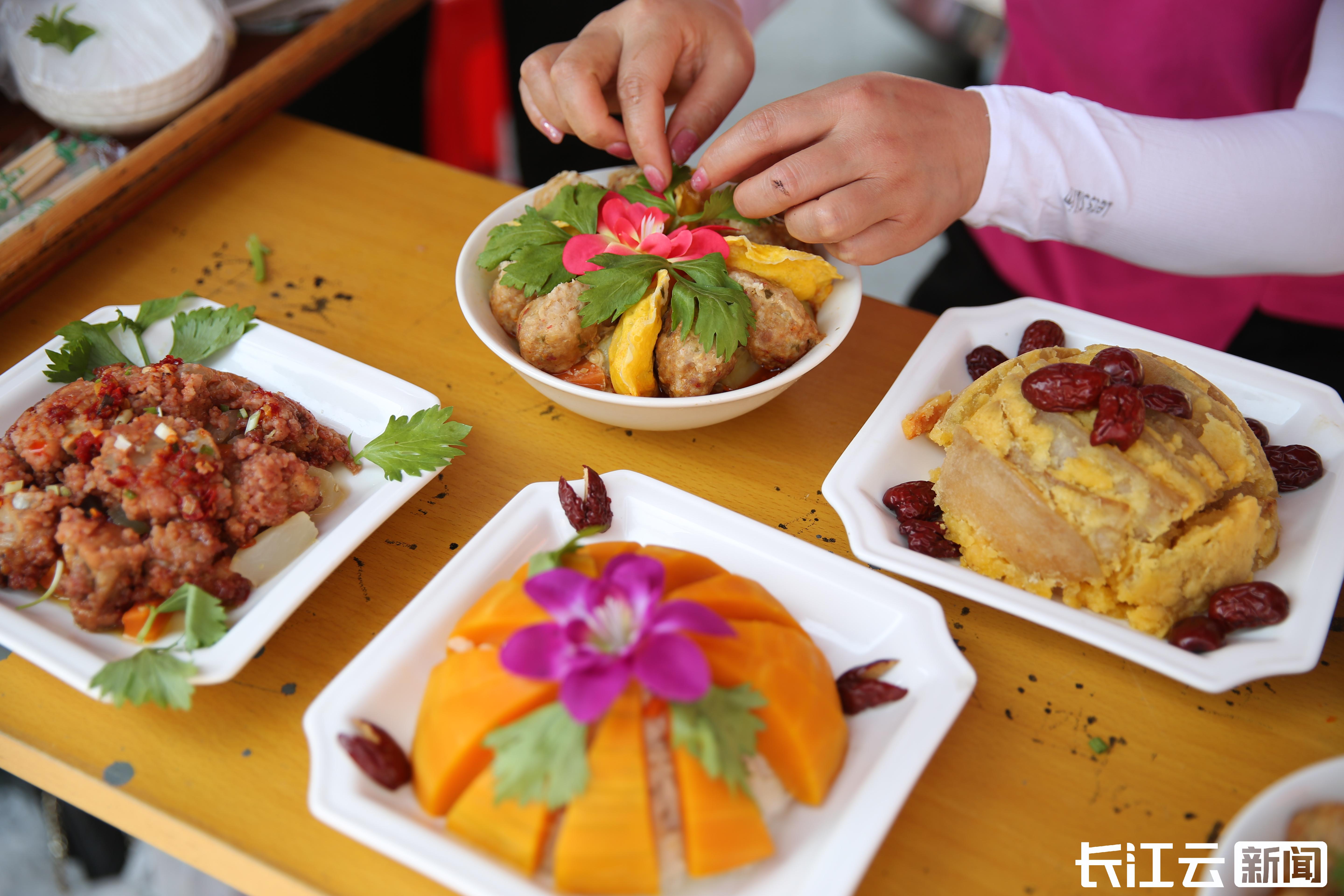 合碗因经济物美价廉,寓意祥和,深受百姓喜爱。今年62岁的杨昔秀从小做得一手好茶饭,精通合碗席手艺,在竹山县城小有名气,如今很多人乔迁、结婚、生子都会请她当大厨做合碗招待宾客。