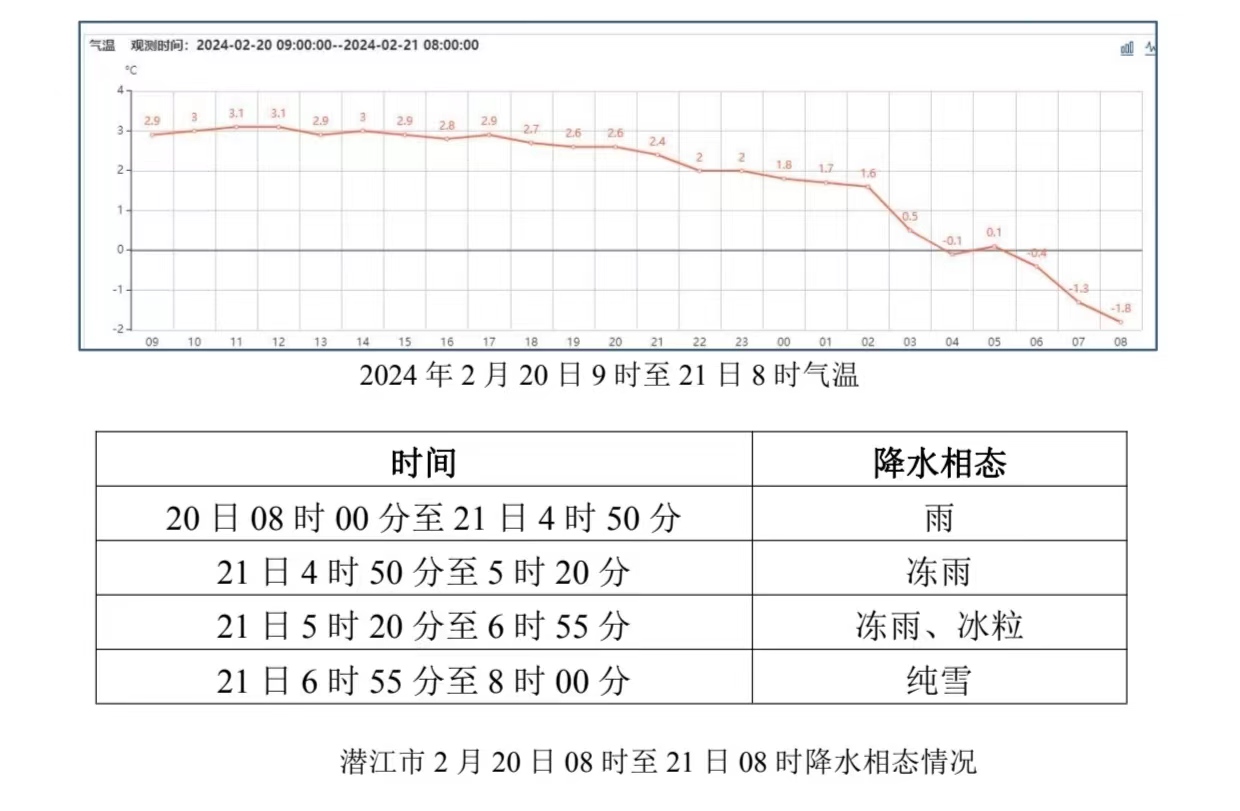 2月20日08时~21日08时,我市降水相态复杂,先后出现雨、冻雨、冰粒、雪,潜江本站降水量17.9毫米。21日08时积雪深度1厘米,电线覆冰厚度1毫米。极大风速最大为借粮湖站17.7m/s(21日03时)。气温过去24小时气温-2~3℃。