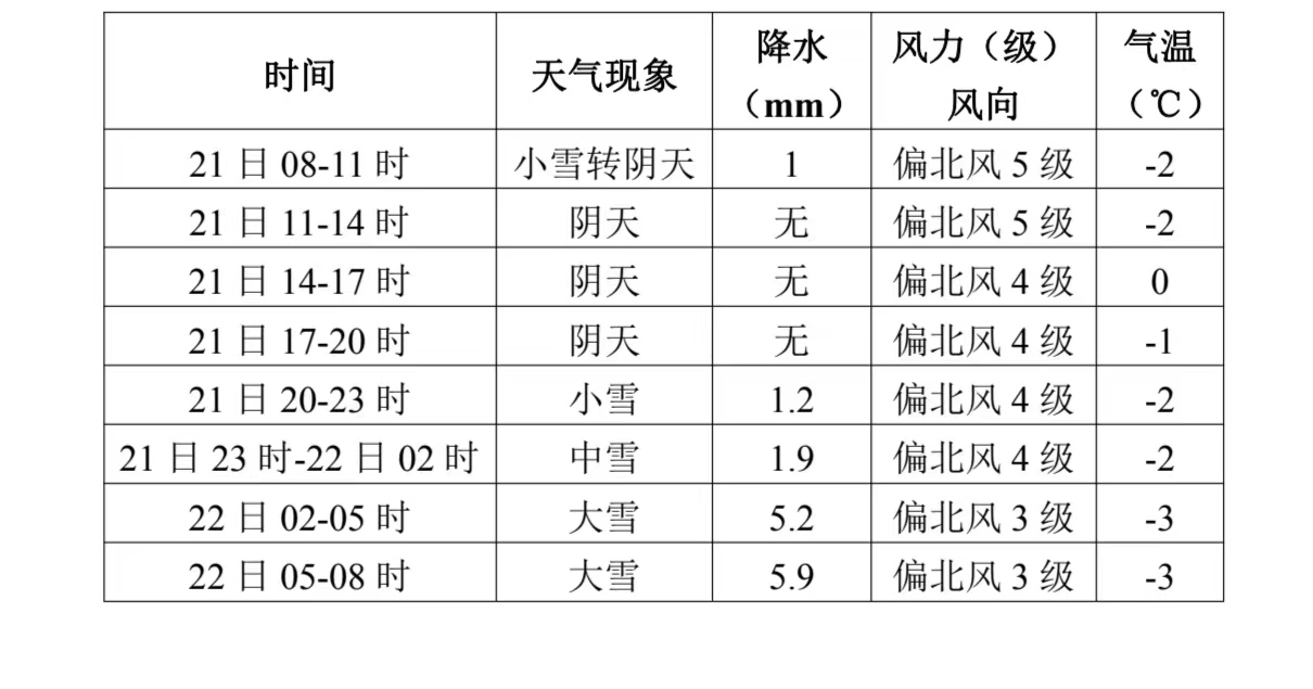 2月21日:白天小雪转阴天,晚上中到大雪,局部暴雪,气温-3~0℃,偏北风4到6级,阵风7到9级。