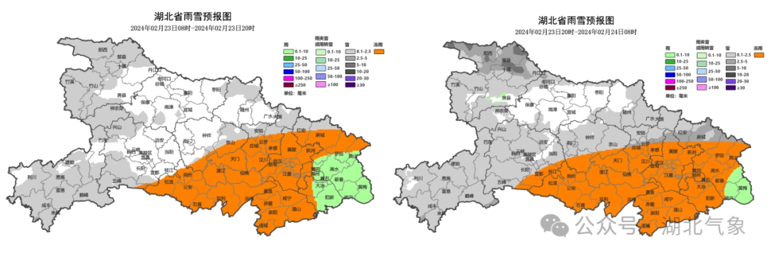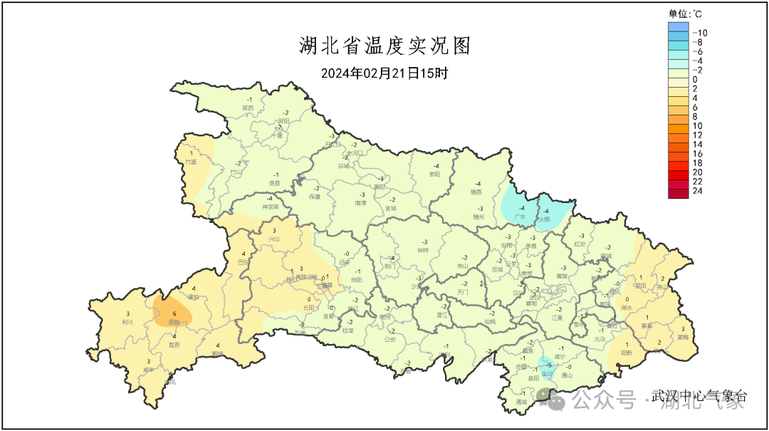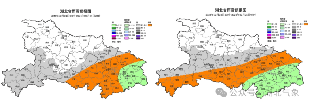 2月24日08时-25日08时,神农架、恩施北部、宜昌北部、荆门北部、孝感北部、随州东部阴天有小到中雪;恩施南部、宜昌南部、荆门南部、荆州、天门、潜江、仙桃、孝感南部、武汉、黄冈北部、咸宁阴天有冻雨或冰粒;十堰、襄阳、随州西部阴天;其他地区阴天有小雨。最高气温大部地区0~3℃,最低气温大部地区-2~1℃。偏北风2到3级。