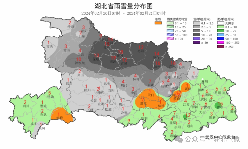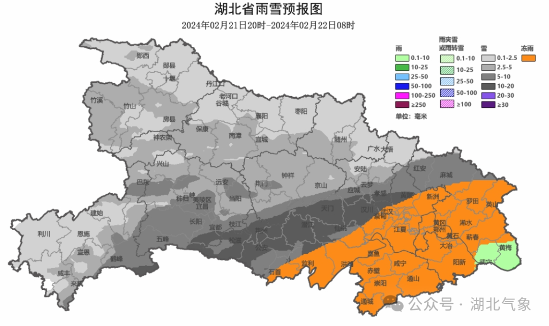 2月21日20时-22日08时,恩施高海拔地区、宜昌、荆门南部、 荆州西部、潜江、天门、仙桃、武汉北部、孝感南部、黄冈北部阴天有大到暴雪或冰粒;十堰、神农架、襄阳、随州、恩施中低 山区、荆门北部、孝感北部阴天有小到中雪;其他地区阴天有冻雨或冰粒。最低气温大部地区-5~-1℃。偏北风4到6级、阵风7 到10级。