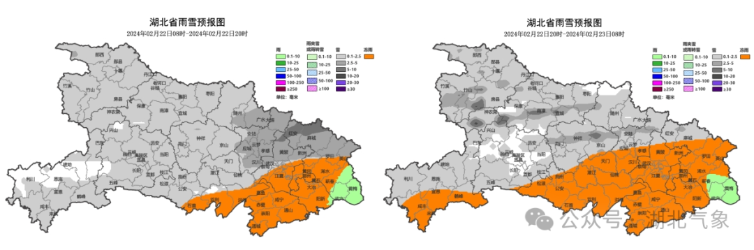 2月22日08时-23日08时,恩施南部、荆州、天门、潜江、仙桃、 武汉南部、黄冈、鄂州、黄石、咸宁阴天有冻雨或冰粒,其他地 区小到中雪、局地大雪。最高气温大部地区-2~1℃,最低气温 北部-6~-3℃、南部-3~0℃。偏北风3到5级、阵风6到8级。