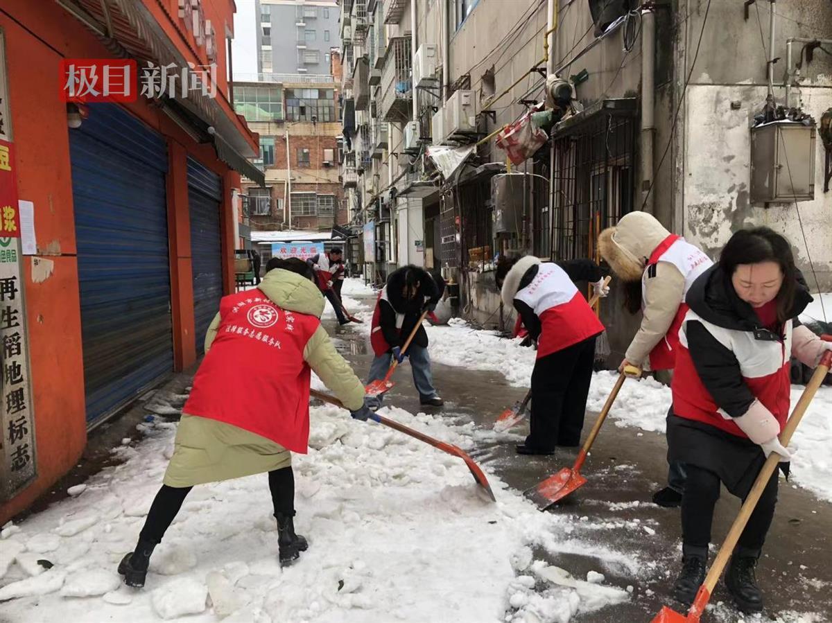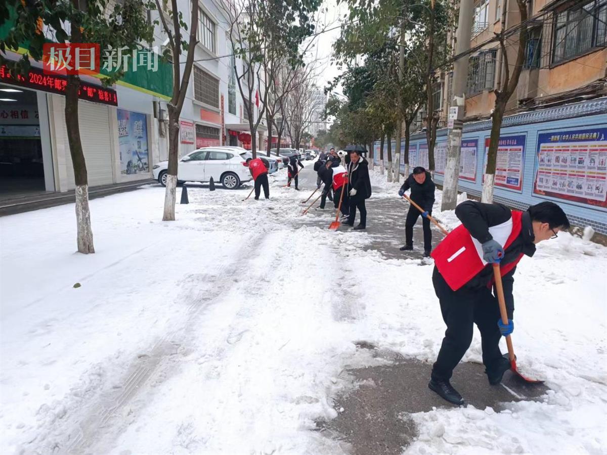 洪湖市司法局将两条包责路段、14个包保小区划分为4个责任区域,全体38名机关干部分四组,身着志愿服务红马甲,下沉到各个责任区域开展铲雪除冰工作。