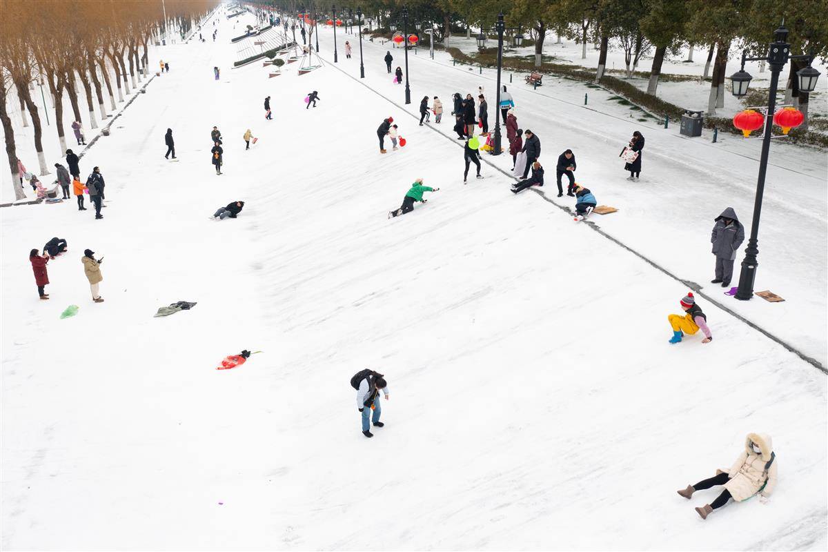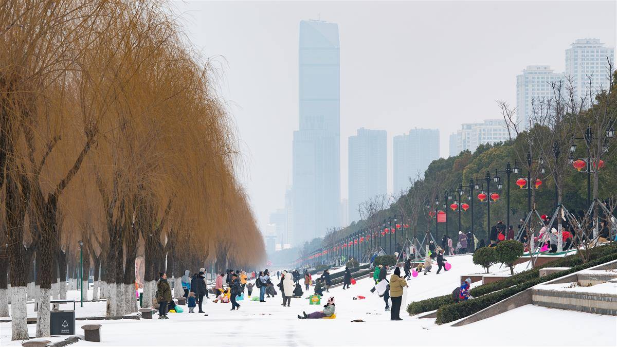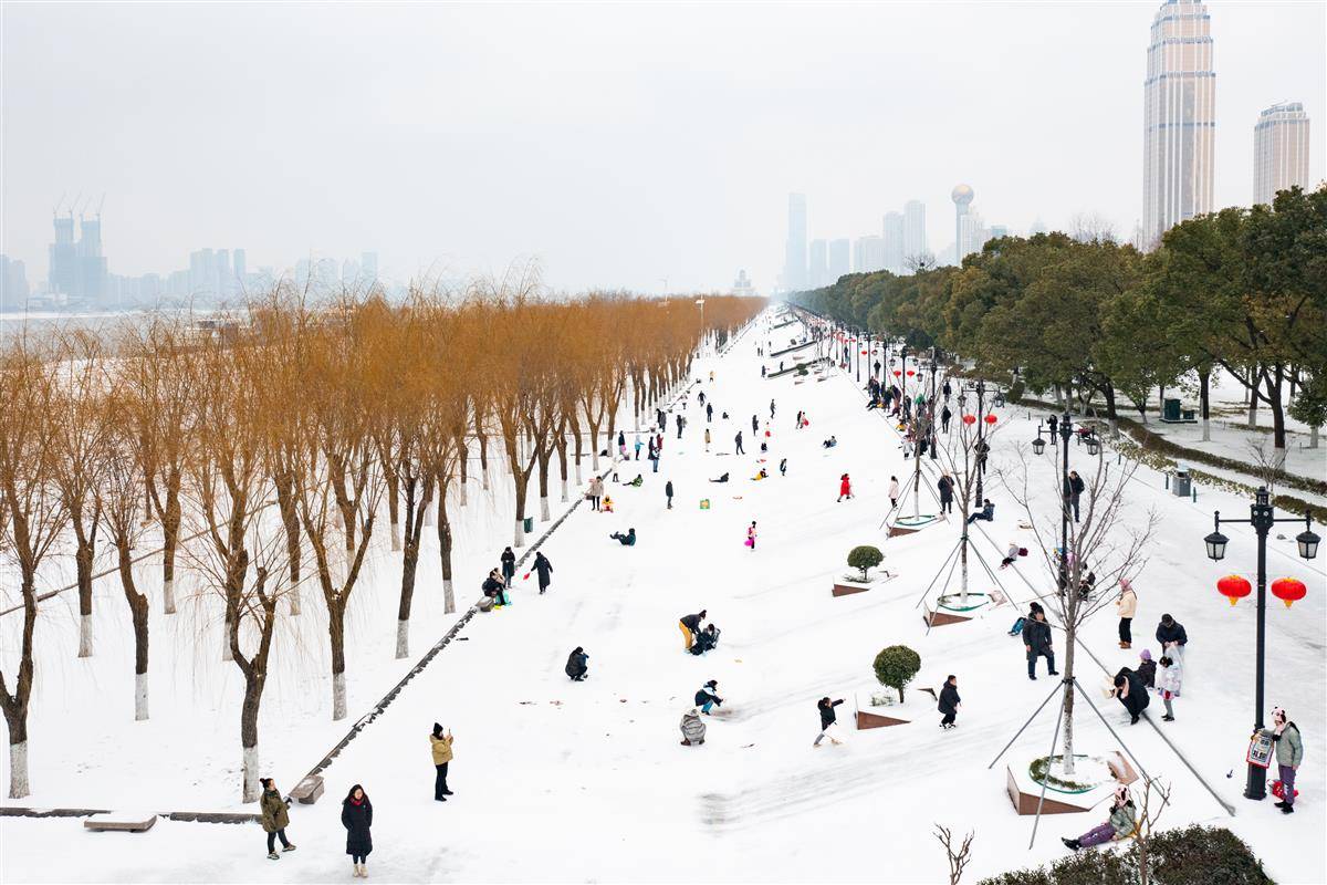 2024年2月23日,受连日来降雪影响,武汉汉口江滩银装素裹,大批市民来到江堤上滑雪,感受冰雪天的独特乐趣。(湖北日报全媒记者 何宇欣 摄)