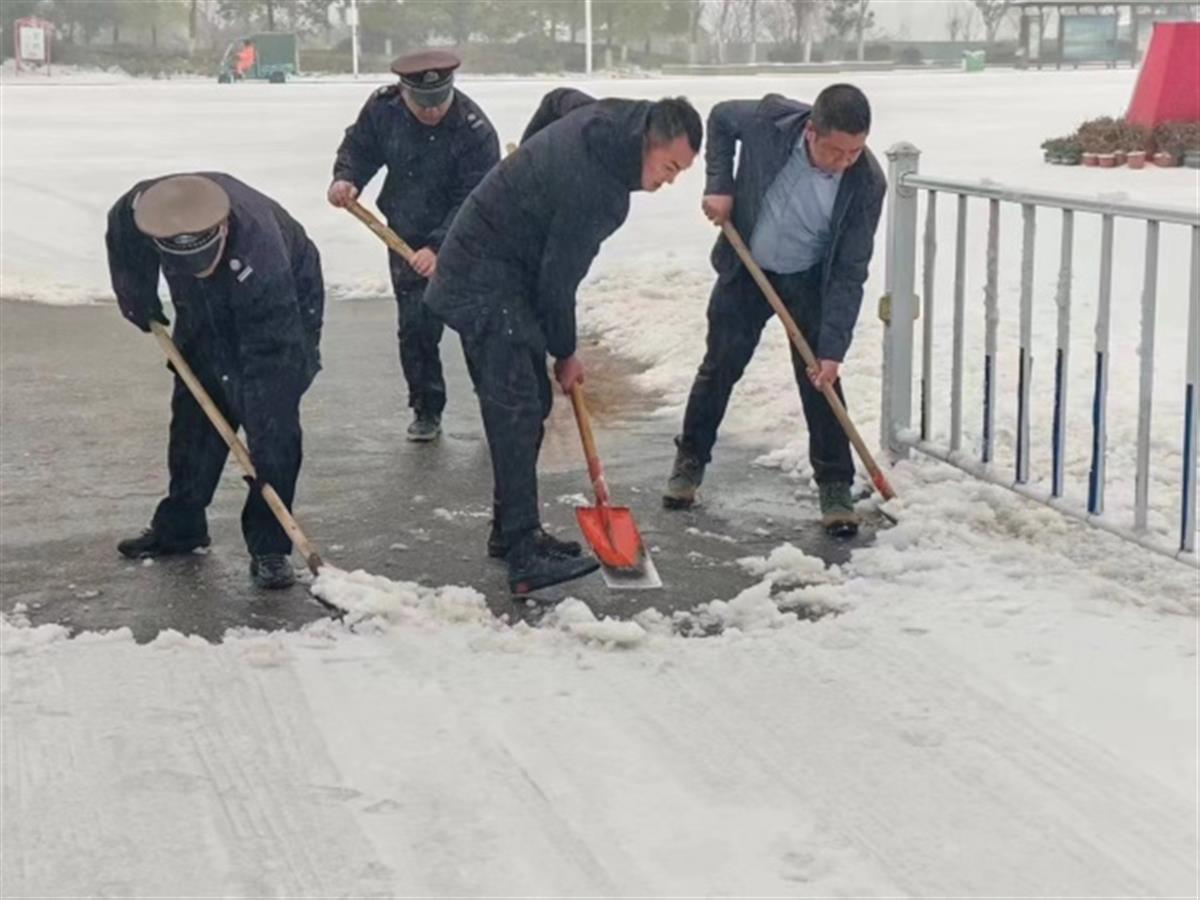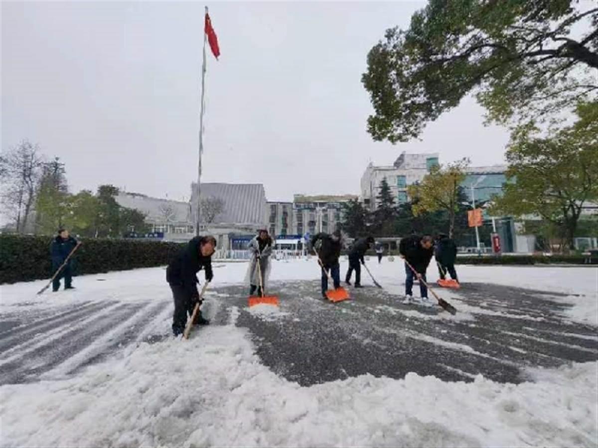 在嘉鱼校区,值班教职工也积极响应学校号召行动起来,齐心协力,共同奋战,扫雪除冰,确保开学时师生通行顺畅安全。