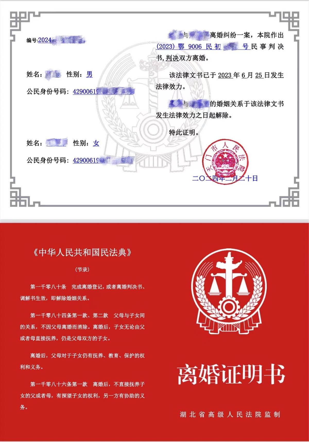 3月1日,极目新闻记者获悉,湖北天门法院向一起离婚案件的当事人发出首份电子版《离婚证明书》,在提供司法便利的同时,也保护了离婚案件当事人的隐私。