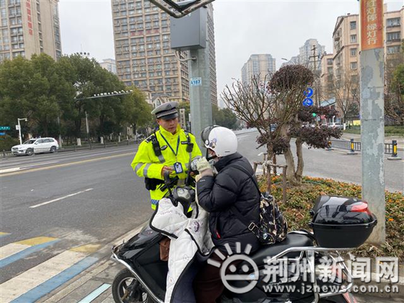 上午9点多,荆州市公安局交管局二大队民警在塔桥路荆沙大道交会路段开展整治行动,这名电动车驾驶员未安要求佩戴头盔,民警对其处以警告处罚。另一名电动车乘坐人员未佩戴头盔被民警拦截。