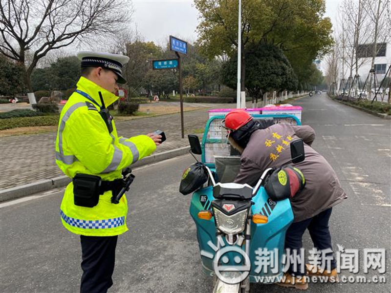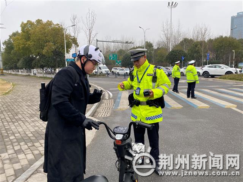 荆州市公安局交管局二大队八中队民警 向绪亭:今天对您进行警告,下次记得把头盔戴好,注意安全。