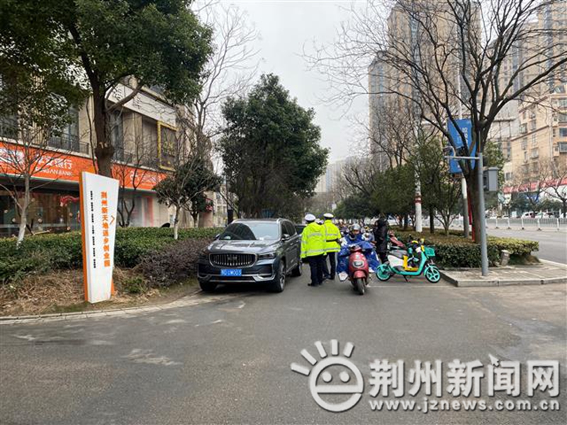 荆州市公安局交管局二大队八中队民警 向绪亭:塔桥路是严管路段,这里是禁止停车的。停在辅道上,阻碍非机动车通行,并且压占盲道,我们将对其进行100元的处罚。