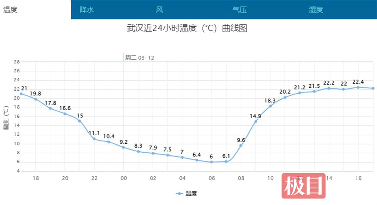 从气象监测数据来看,12日武汉的气温弹跳能力相当强:早间7时,武汉仅6.1℃,9时就飞升至14.9℃了,11时就突破20℃,此后一直在20.2-22.4℃之间波动。