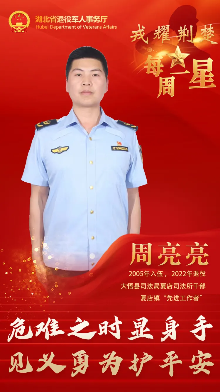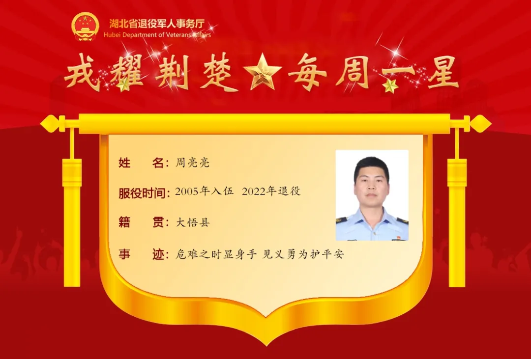 荆楚大地,见证老兵荣光。全省退役军人事务部门组建以来,各地不断强化退役军人先进典型宣传引领,先后推出了张富清、尹文杰、张裕等一大批先进典型,产生了良好社会反响。为持续讲好全省退役军人奋进新征程、建功新时代的故事,营造尊军崇军浓厚氛围,不断提升广大退役军人的尊崇感、获得感、荣誉感,推动形成先进典型不断涌现,示范带动作用更加显著的生动局面,现推出退役军人“戎耀荆楚·每周一星”系列报道。