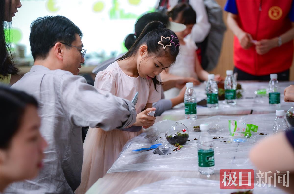 这是一场“童年里的端午味道”——绿豆糕的体验制作活动,而隔壁课堂的孩子们正在开展一堂“大自然的拓荒者”——苔藓微生态景观制作活动。玻璃皿、泥土、苔藓、动物饰品、蓝沙,孩子们在志愿者的指导下,把苔藓铺在泥土上,把蓝沙撒成一条溪流,小鸭子也在小溪里游泳。“还要喷水在苔藓上哦,这样它们会生长得更好。”志愿者每讲解一步,孩子们都亲自动手尝试,一个个搭配精致但风格各异的苔藓生态景观很快呈现在家长面前。