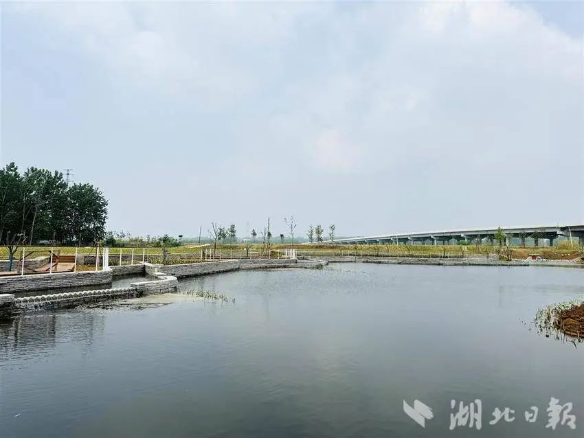 6月6日,湖北日报全媒记者走进这片人工湿地,沿着休闲步道游览,黄菖蒲、黄花鸢尾等植物栽种成片,溢流堰处流水潺潺,仿佛一座小型的城市公园。