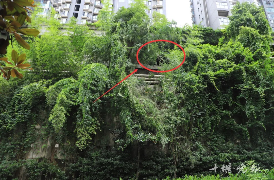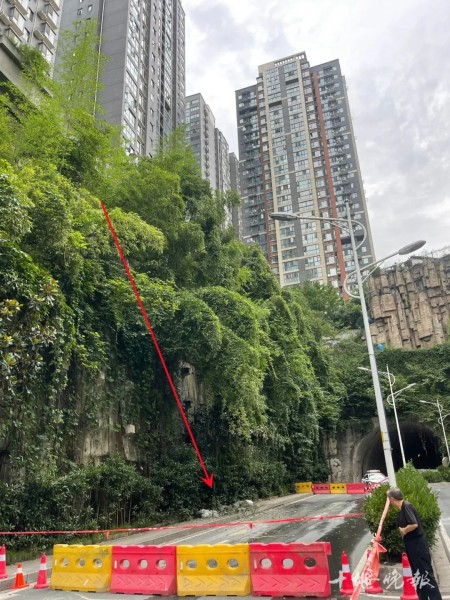 在附近一名安保人员指引下,记者来到封闭路段的一处区域看到,地面上残留着一些水泥块。水泥块上方的墙壁上有一个不规则的大洞,洞口距离苏州路地面约10米的高度,沿墙绿植均有被重物碾压的痕迹。