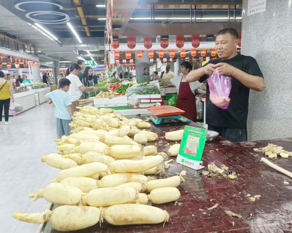 记者在采访中发现,和猪肉价格不同的是,进入夏季,多种蔬菜的价格变得亲民了。昨日在象山菜场内,蔬菜摊位上摆放着满满当当的新鲜蔬菜。
