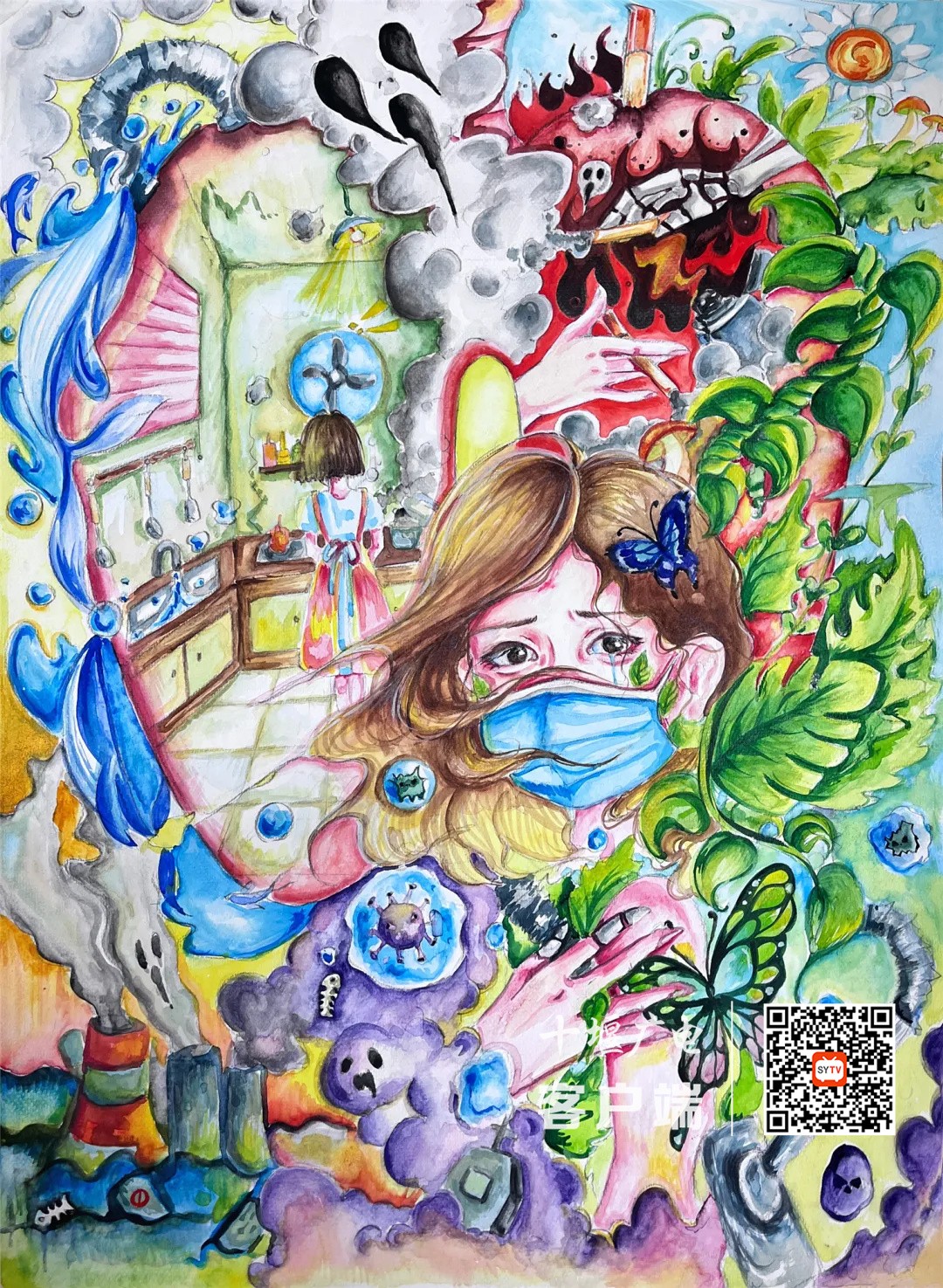 获得中学组绘画作品优秀奖的是十堰职业技术(集团)学校的王佳妮同学,作品名称为《同呼吸共命运》,指导老师为廖原。