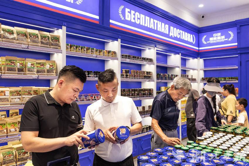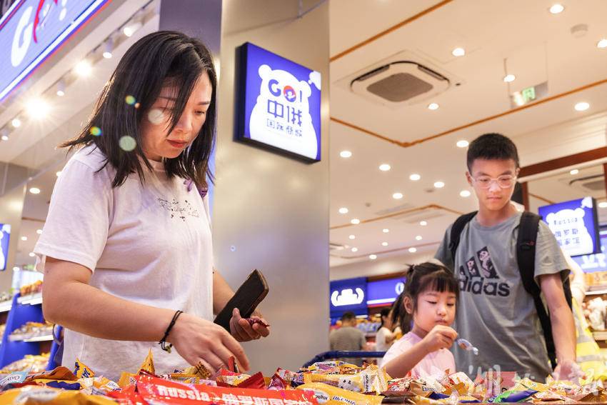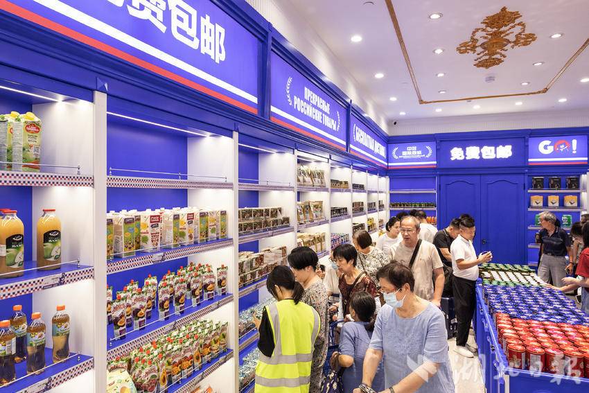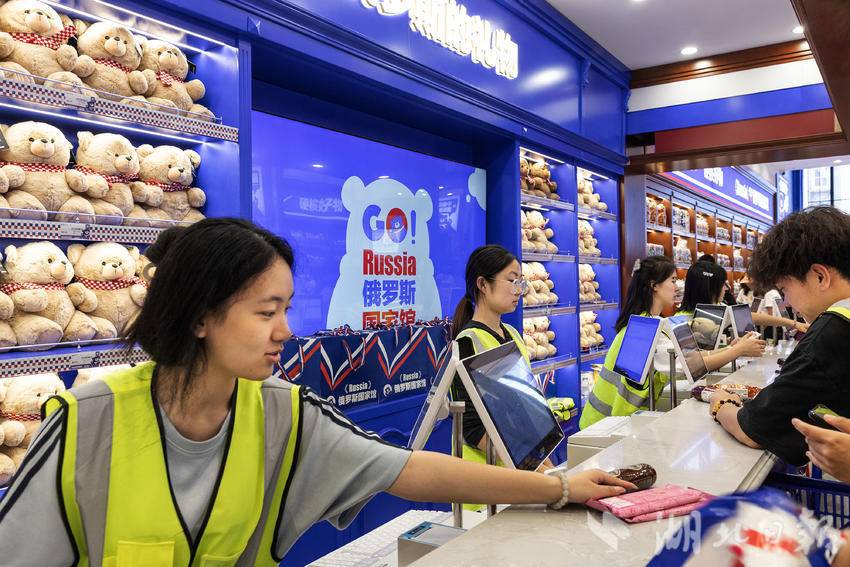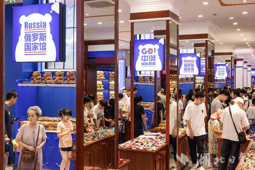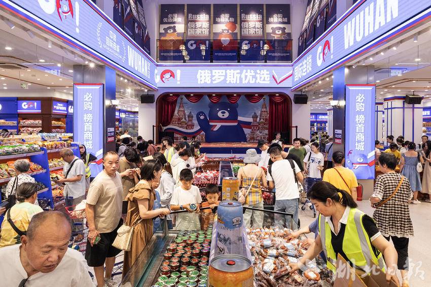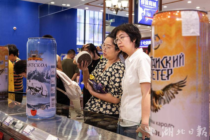 7月9日,在武汉市江汉路步行街,一家主营俄罗斯商品的超市内人头攒动、热闹非凡,市民游客前来挑选自己心仪的俄罗斯特色产品,其中大列巴和红肠最受顾客青睐。