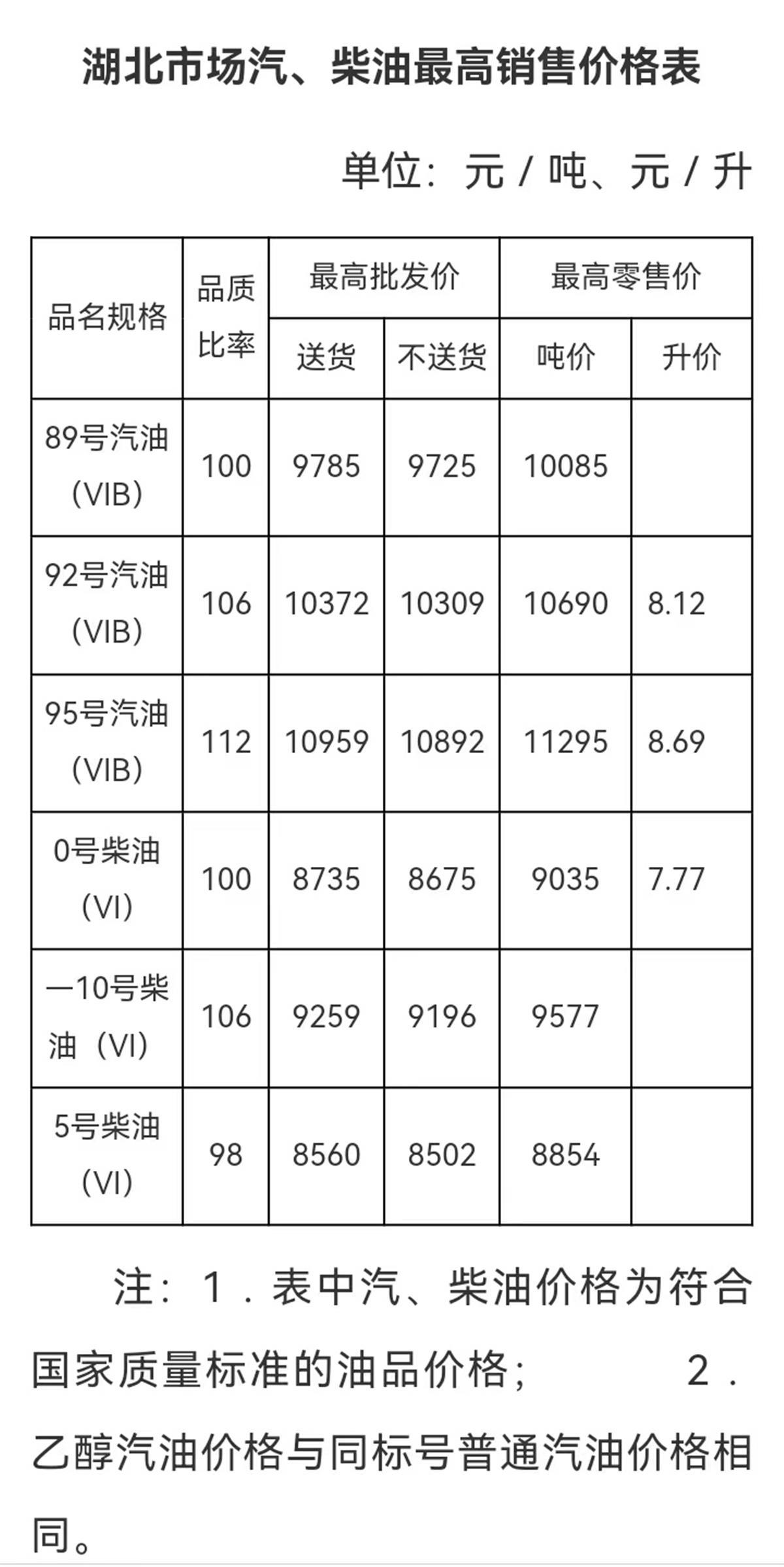 7月11日,湖北省发改委发布公告,湖北成品油价格按机制上调,92号汽油、95号汽油、0号柴油每升分别上调0.09元、0.10元、0.09元。调价后,92号汽油每升价格为8.12元。