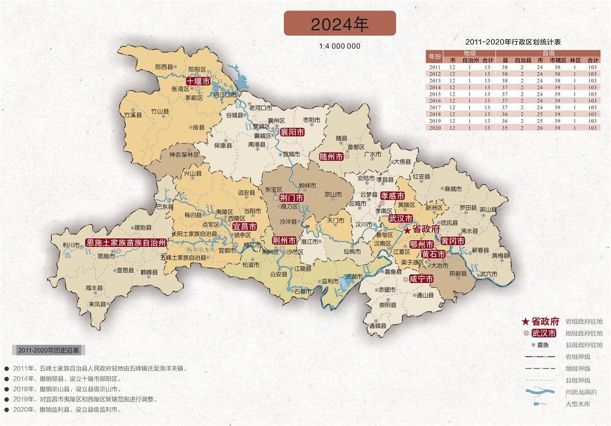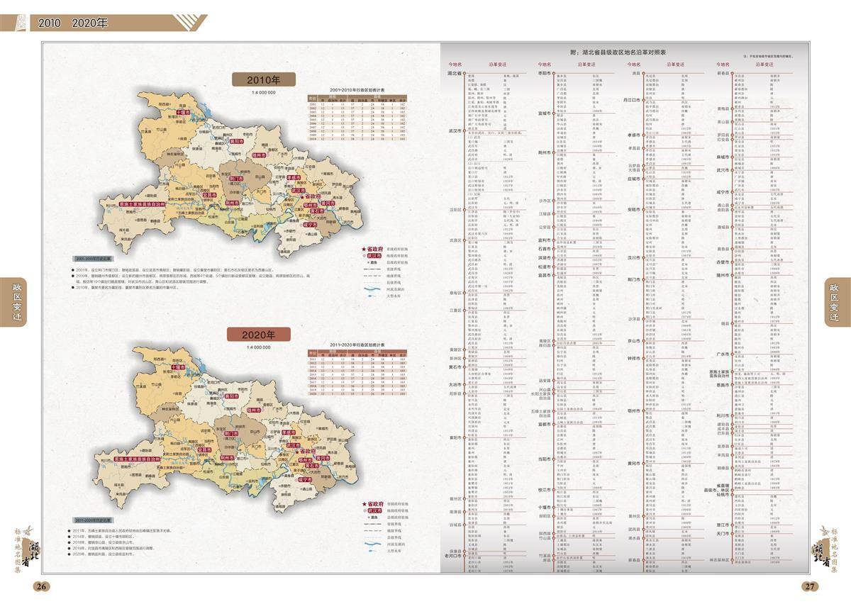 2010年、2020年的湖北行政区划地图及全省县级政区地名沿革对照表。