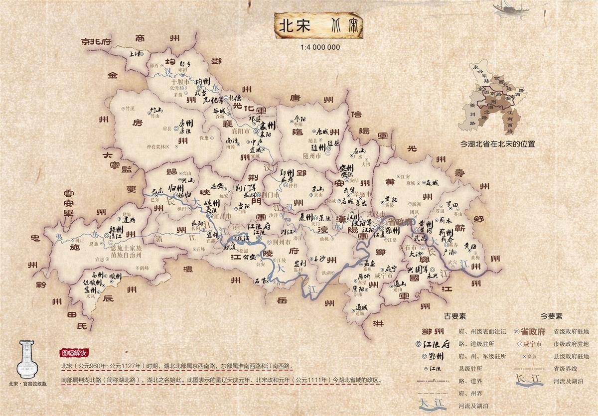 在湖北省民政厅行政区划咨询论证专家、湖北省行政区划与地名文化研究会研究员孙平看来,直至北宋时期,“湖北”两字才正式登上历史舞台,首次出现在行政区划名称当中。翻开北宋时期的“湖北地图”,南北狭长的“荆湖北路”包含了今湖北南部和湖南北部区域,湖北之名便始于此。孙平解释,“路”为北宋一级行政区划,相当于现在的省,“湖北”两字因荆湖北路大部分区域在洞庭湖以北而来。