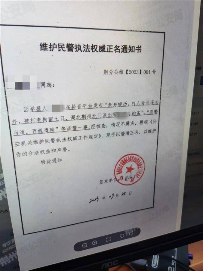 荆州市公安局荆州区分局为受诬告民警发放的《维护民警执法权威正名通知书》。(省公安厅供图)
