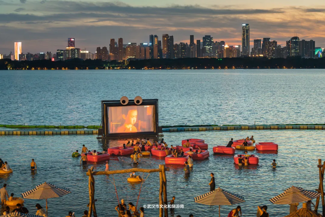 这是东湖沙滩今年新增的特色玩法——水上漂浮影院。