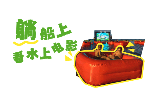 △红色漂浮船像一个大沙发,可以躺着看电影。每张船可以容纳2名成人和1名小朋友。换上泳衣去玩更畅快。
