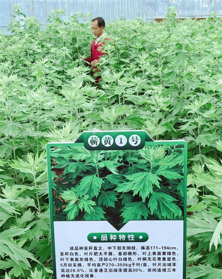 在湖北艾师傅科技有限公司蕲艾种植基地,大棚里的“蕲黄1号”“蕲青1号”植株生长健壮,叶片肥大,长势喜人,它们是国家地理标志产品“蕲艾”的两个新品种,由湖北中医药大学刘大会教授团队研发培育,优良的艾品种为蕲艾产业突破性发展夯实了根基。
