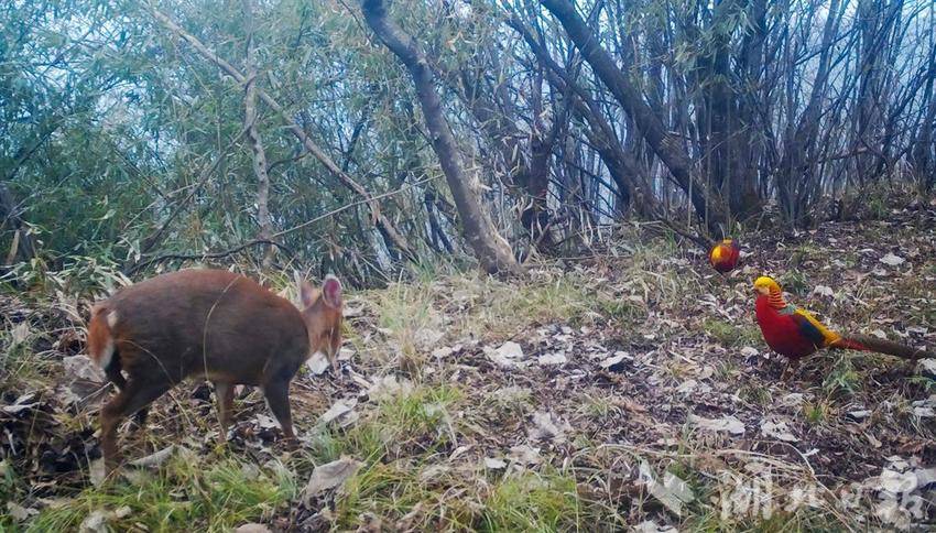 8月7日,湖北堵河源国家级自然保护区(竹山县)白河管理站工作人员在整理红外相机资料影像时,惊喜地抓拍到一只小麂与两只红腹锦鸡(又名“金鸡”)在林中“同框”的画面。