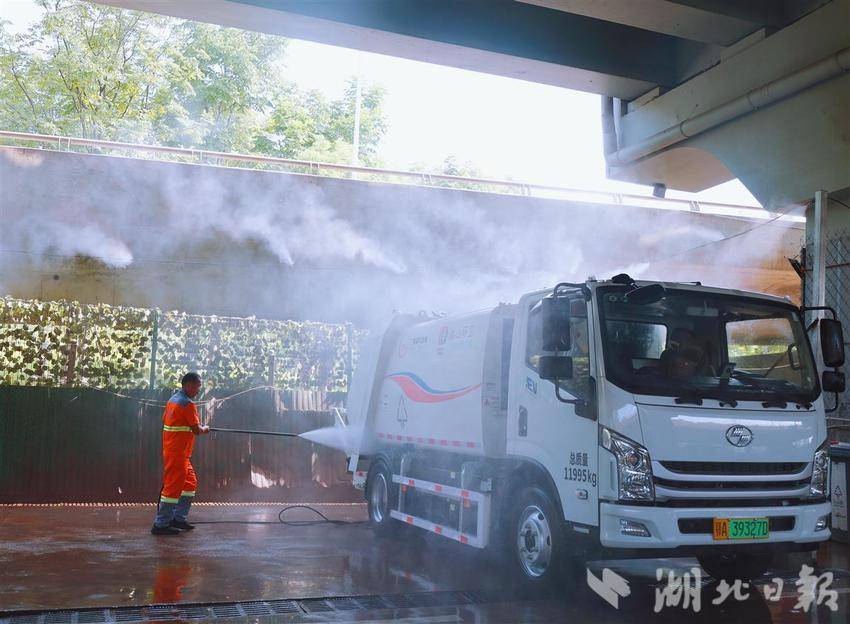舒美介绍,在烽火停保场内记者看到,场地入口区域被规划为垃圾清运车的停放区,各类车辆按照“一车一位”的原则,停放整齐,停放区后方围栏上的喷雾装置约15分钟启动一次,定时消杀。在车辆专属清洗区域,还配备了抹布、水桶、高压水冲洗枪等洗车设备,设置了加装除臭用品的喷雾,不仅能让环卫车辆去除内外污垢,还能“香气喷喷”出门。