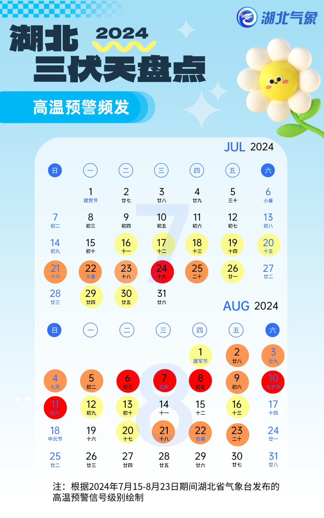 最高级别的高温红色预警,共发布6期,1期在初伏,5期在中伏。整个三伏天里40℃范围最大的一天,正是湖北省气象台发布今年首期高温红色预警的日子——7月24日。当天全省近9成乡镇气温超过37℃,其中396个乡镇超过40℃,为三伏期间最多。