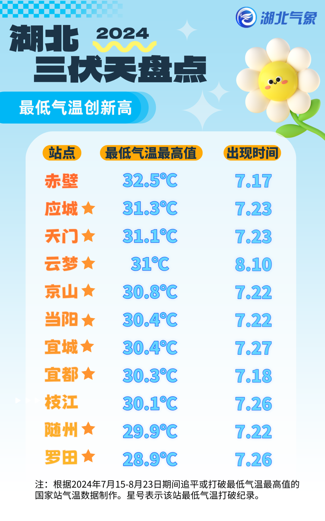24日20时-25日08时,全省晴天到多云,其中鄂西北、鄂西南局地有阵雨或雷阵雨。最低气温25~29℃,偏南风2到3级。