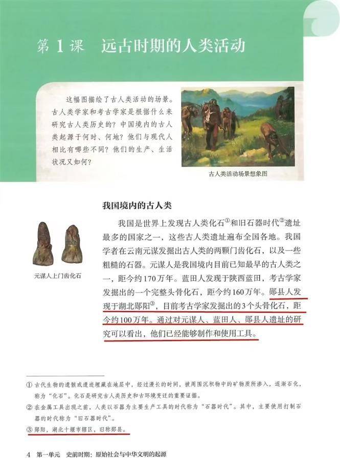 此次新版历史教科书,第一单元“史前时期:原始社会与中华文明的起源”单元目标导学中,明确指出,“我国有百万年的人类史,元谋人、蓝田人、郧县人、北京人是其中的代表。”在第1课“远古时期的人类活动”中介绍:“郧县人发现于湖北郧阳,目前考古学家发掘的3个头骨化石,距今约100万年。通过对元谋人、蓝田人、郧县人遗址的研究可以看出,他们他们能够制作和使用工具。”此外,在注释中补充介绍:“郧阳,湖北十堰市辖区,旧称郧县。”所配“中国主要古人类遗址分布图”,清晰标注郧县人遗址的位置。