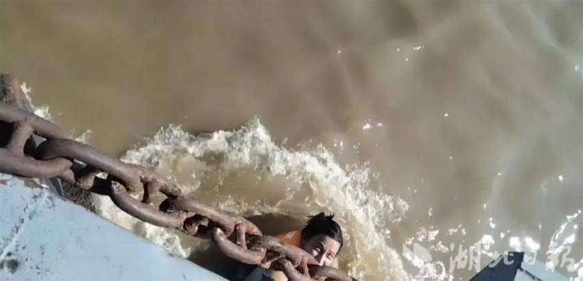 7月21日下午3时50分,汉口王家巷江面上一艘趸船船头,一个黑点在江面起伏。湍急的江水不断往趸船底部“钻”,一男子死死抓住船头一根锚链,勉强支撑自己不被江水吸入趸船下,发出求救声。