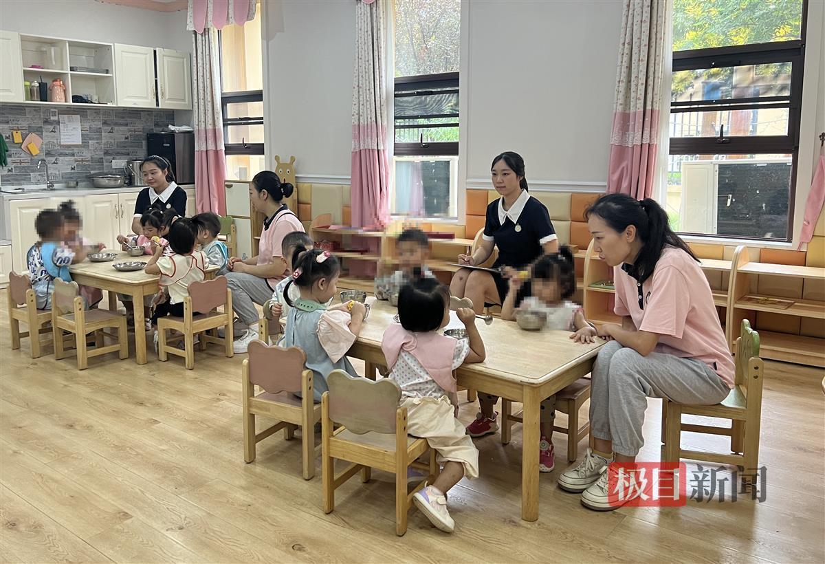 “小朋友,坐好!认真吃东西哟!”在暻皇托育中心,10多名幼儿正围着餐桌吃着午餐,四名老师忙着在桌旁照看。进门的墙上,张贴着本周的托育学习计划和每日食谱,方便家长们随时了解。