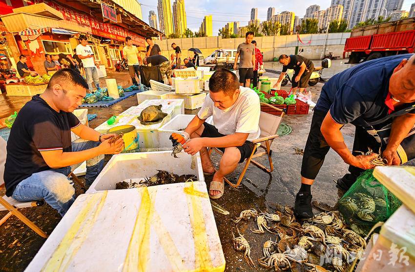 9月20日清晨,武汉白沙洲农副产品大市场水产区内,许多批发商扎堆在一起卖螃蟹,老板们忙着绑螃蟹、装礼盒,一派繁忙景象。