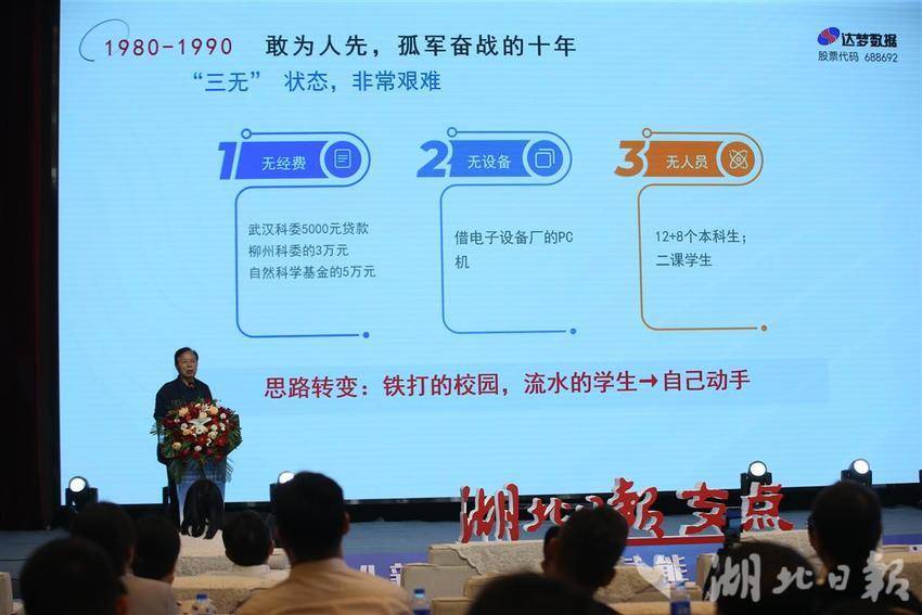 80岁高龄的武汉达梦数据库股份有限公司董事长、创始人冯裕才在讲台上分享创业之路