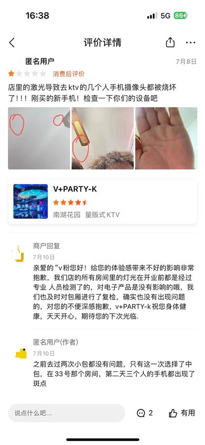 记者在翻阅该KTV在电商平台上的消费者评价时发现,今年7月8日,也有顾客投诉“店里的激光导致去KTV的几个人手机摄像头都被烧坏了!!!刚买的新手机!检查一下你们的设备吧”,而商家对此投诉的回复是:“我们店的所有房间里的灯光在开业前都是经过专业人员检测了的,对电子产品是没有影响的哦,我们也及时对包厢进行了复检,确实也没有出现问题。”