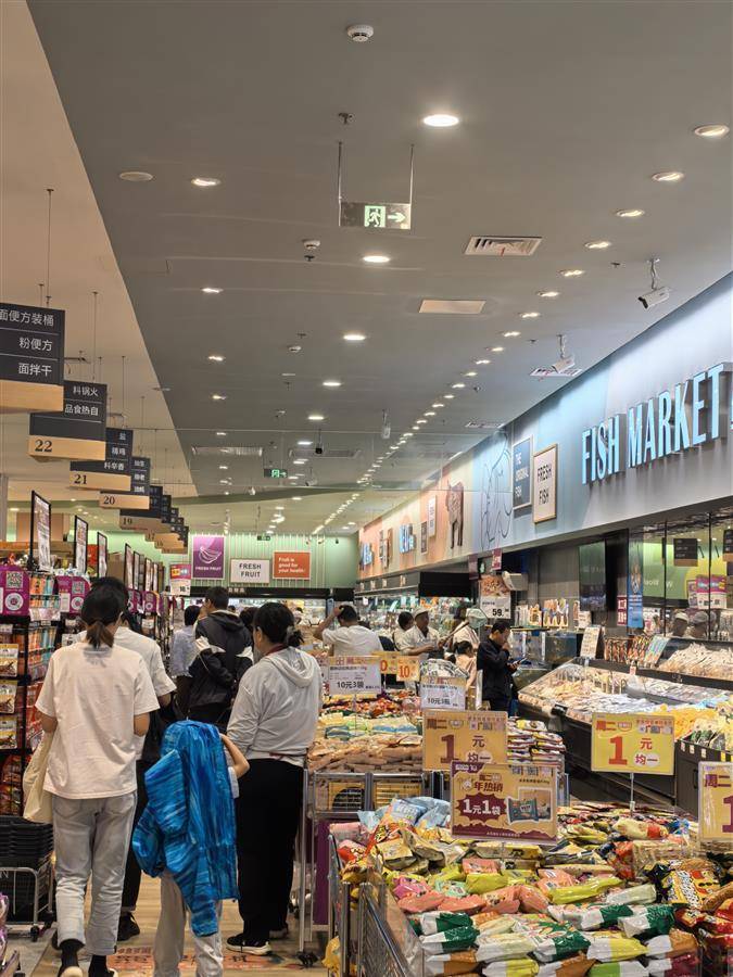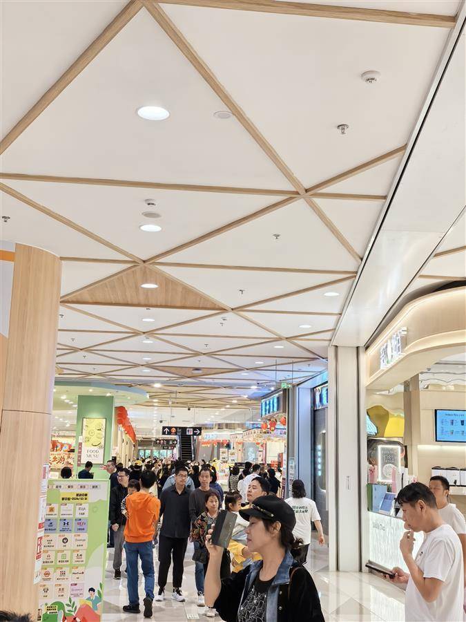 在紧邻大花岭的江夏永旺梦乐城,永旺超市里人头攒动,入口处的早餐区内,市民们正悠闲地品尝武汉热干面、牛肉面等美食。购物区内,大人小孩争相选购心仪的商品,促销员的特价优惠吆喝声此起彼伏。