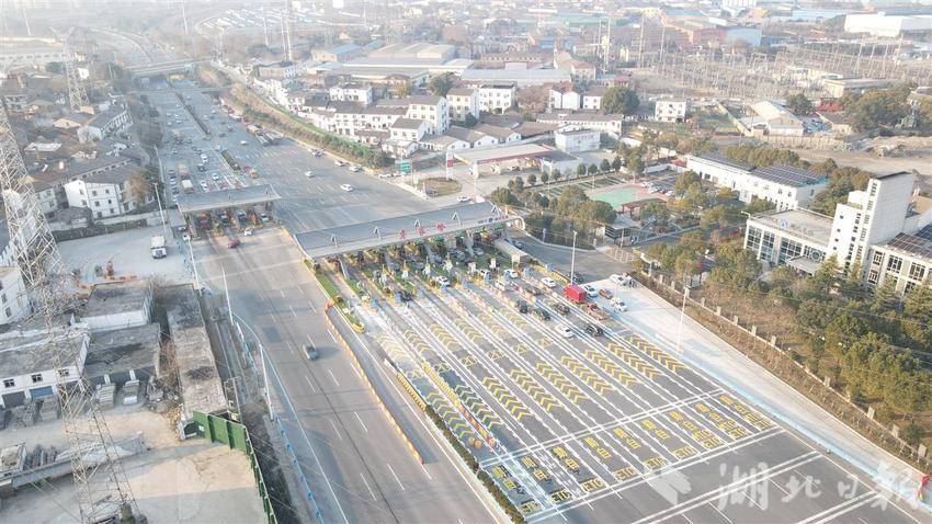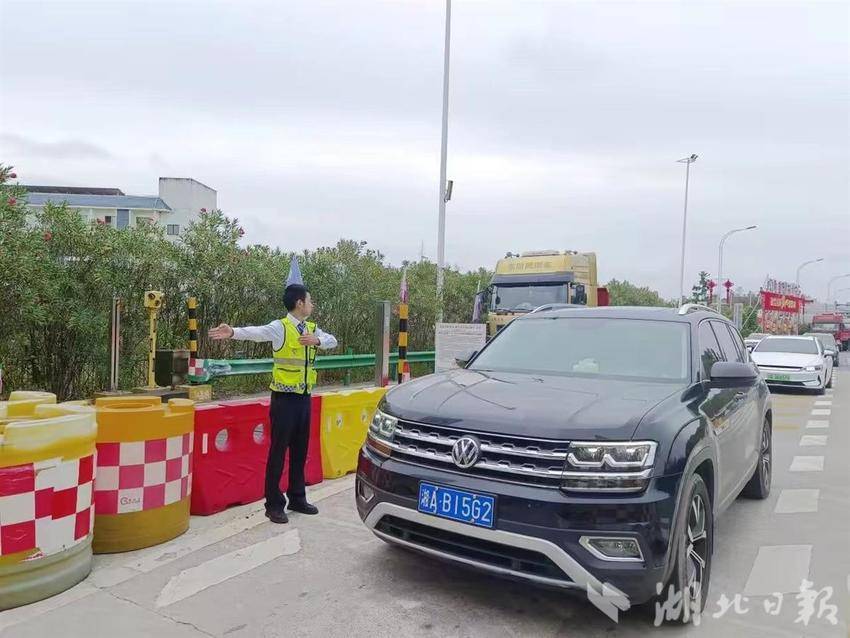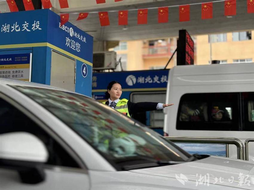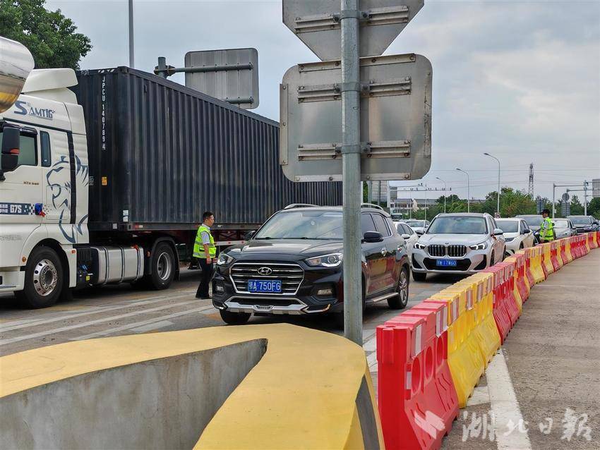 龚家岭收费站是武汉的东大门,日均车流量达6万辆。当天,最左侧的进口车道已设为潮汐车道,作为应对返程高峰的出口车道。在收费站外广场,9个出口车道上,一辆辆返程车在“准自由流”模式下无感通行。准自由流技术,就是在收费站前设置ETC龙门架,提前进行ETC预交易,免费通行时段交易金额为零,交易成功后车辆可选择任意一条车道通行,车辆通过时速可达40公里,通行效率提升约40%。